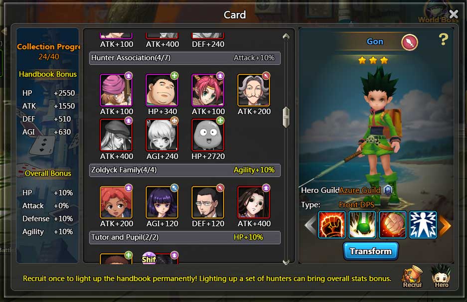 Hunter X Hunter Online is a free-to-play browser MMORPG based on the popular manga and anime. Players build a team of hunters which can be organized into formations for use in strategic play. The gameplay is similar to other anime-based games like Dragon Ball Z Online and Naruto Online.